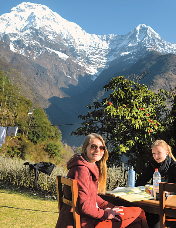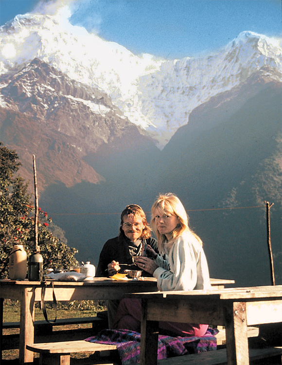 Nach Beendigung meines Studiums konnte ich Anfang 1988 mit meiner (jetzigen) Frau einen lang gehegten Traum verwirklichen: Ein Jahr lang reisten wir durch Thailand, Birma, die Philippinen, Hongkong, Südchina, Indonesien und Malaysia. Zuletzt verbrachten wir drei Monate in Nepal, genossen die Freundlichkeit der Nepalis und das Wandern in der fantastischen Himalaya-Landschaft. Im Frühjahr 2013 reiste unsere Tochter Teresa mit einer Freundin ebenfalls nach Nepal. Als wir ihre Bilder anschauten, stellten wir fest, dass sie offenbar am selben Ort namens Chomrong auf dem Weg zum Annapurna-Basiscamp übernachtet hatte und den Rhododendron-Busch vor dem Annapurna-Massiv ebenfalls fotogen fand. Nur die Sitzmöbel vor der Lodge haben sich verändert…