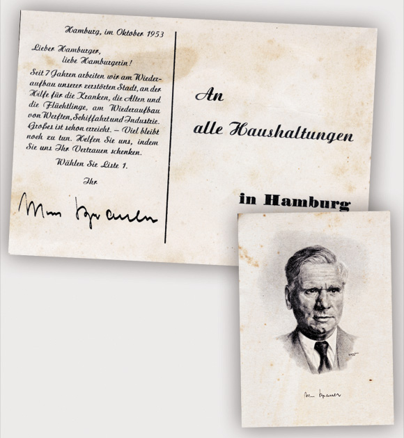Im Nachlass meiner Mutter fand ich beiliegende Wahlwerbepostkarte der SPD von vor 60 Jahren. Der Name des Bürgermeisterkandidaten, Max Brauer, war uns Kindern früh geläufig. Unsere Mutter war eine enge Freundin seiner Haushälterin, seit sie vor dem Krieg mit ihr zusammen woanders „in Stellung“ gewesen war. Kam diese „Tante Änne“ uns besuchen, fuhr sie den goldenen Mercedes des Brauers – für unseren kinderreichen, aber autolosen Haushalt ein Ereignis! Inzwischen habe ich den Lebenslauf Max Brauers nachgelesen und bin beeindruckt, was er für Hamburg erreicht hat.