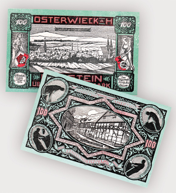 Im Nachlass meiner Eltern fand ich einige Geldscheine aus Leder. Das Notgeld aus den Jahren 1922/23 stammt aus Osterwieck, einem kleinen Ort zwischen Halberstadt und Goslar, in dem meine Mutter aufwuchs. Die Scheine fühlen sich samtweich an und sind immer noch schön anzusehen. Die Banknote über 100 Mark liebe ich besonders – weil meine Mutter nämlich das Gedicht in der Umrandung früher häufig zitierte: