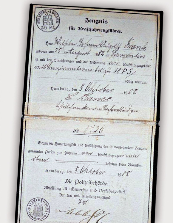 In den Dokumenten meiner 1943 in Hamburg ausgebombten Tante fand ich den Führerschein meines Großvaters August Frank. 1908 bezahlte er für den Ausweis 50 Pfennig. Ihm wird bescheinigt, »mit der Bedienung von Kraftfahrzeugen mit Benzinmotoren bis zu 10 PS völlig vertraut« zu sein. Die Polizei hat überdies keine Bedenken, dass er eine zuverlässige Person sei. Ich weiß aus Erzählungen meiner Mutter, dass er einer der ersten Hamburger Taxifahrer war. Er fiel 1916 in Frankreich. Ich hätte ihn sehr gern kennengelernt.