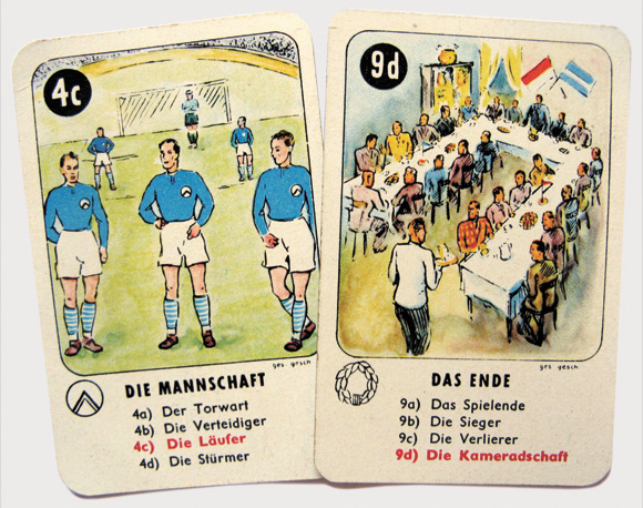So war Fußball in den fünfziger Jahren: ein Torwart, zwei Verteidiger, drei Läufer und fünf Stürmer. Libero, 4-4-2- und andere Systeme? Unbekannt! Und ob es nach Ende des Spiels heute auch noch so zugeht wie auf der Quartettkarte?