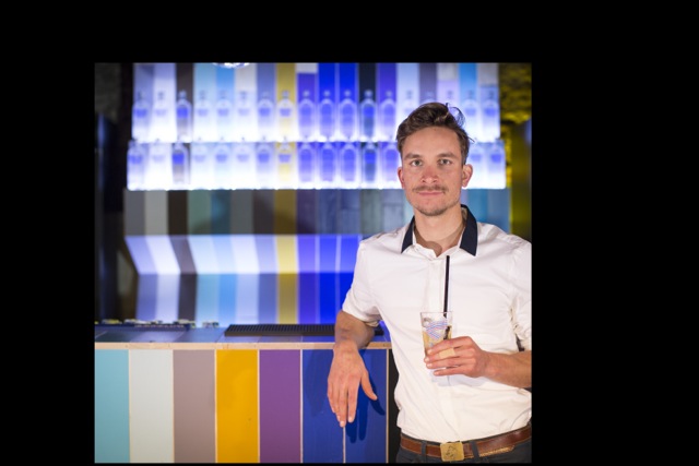 Der Künstler Jay Gard an der von ihm für den Sponsor des Abends Absolut entworfenen Art Bar