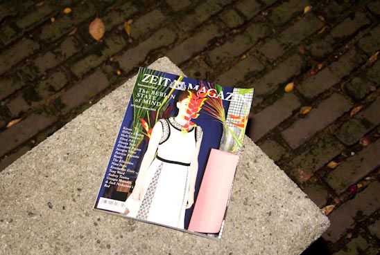 Christoph Amend dankte ZEIT-Verlagsleiterin Stefanie Hauer und dem Executive Editor der internationalen Ausgabe, Jürgen von Rutenberg, und der ebenfalls anwesenden französischen Fotografin Brigitte Lacombe, die seit fast vierzig Jahre in New York lebt – „denn ohne Brigitte wären wir heute Abend nicht hier.“ Als Lacombe, die für alle großen amerikanischen Zeitschriften von Vanity Fair bis zum New York-Magazine arbeitet und Hausfotografin des Film-Regisseurs Martin Scorsese ist, im vergangenen Jahr die Fotokolumnistin des ZEITmagazins war, hatte sie Amend bei einem Mittagessen in Berlin erzählt, wie sehr sie die Themen und die Gestaltung des Magazins schätze – „I only wish I could read it.“