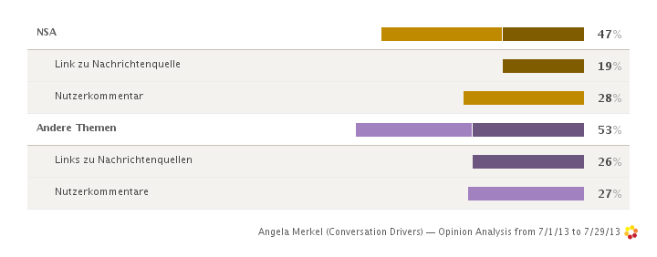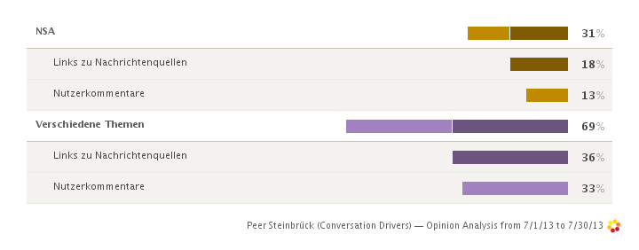 Für diese Interpretation sprechen auch die Themen, die in Kommentaren zu Merkel und Steinbrück angesprochen werden. Hierzu untersuchten wir alle als relevant eingestuften Nachrichten, die zwischen dem 1. und dem 30. Juli 2013 die Worte „Angela“, „Merkel“, „Angie“, „Peer“ oder „Steinbrück“ enthielte. Den Crimson Hexagon-Algorithmus richteten wir so ein, dass er zwischen Nachrichten zur NSA-Affäre und solchen zu anderen Themen unterscheiden kann. Zusätzlich sollten Tweets mit Links zu Nachrichtenquellen im Netz (z.B. Artikel auf Internetangebote traditioneller Medienunternehmen oder Blogs) und reine Nutzerkommentare unterschieden werden.