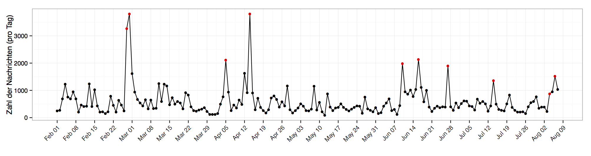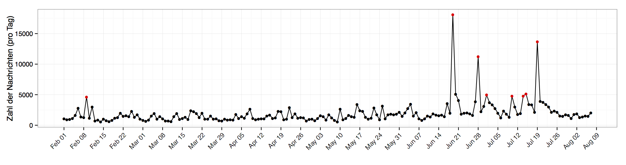 In einem ersten Schritt identifizierten wir alle Nachrichten, die zwischen dem 1. Februar und dem 7. August 2013 die Worte „Angela“, „Merkel“ oder „Angie“ enthielten. Da sich natürlich nicht alle Twitter-Nachrichten mit diesen Begriffen tatsächlich auf Angela Merkel bezogen, trainierten wir den Crimson Hexagon-Algorithmus darauf, thematisch relevante von nicht relevanten Nachrichten zu trennen. Durchschnittlich wurden dabei pro Tag etwa 83% aller Nachrichten mit den Worten „Angela“, „Merkel“ oder „Angie“ als einschlägig eingestuft. Abbildung 1 zeigt im Zeitverlauf die Zahl relevanter Botschaften, die sich laut Algorithmus auf Angela Merkel bezogen.