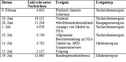 Die Tabelle zeigt, dass über Angela Merkel zu unterschiedlichen Anlässen stark getwittert wurde. Einige dieser Ereignisse, wie der Rücktritt Annette Schavans und verschiedene Stellungnahmen Angela Merkels zu der NSA-Affäre, sind Nachrichtenereignisse. Medien berichten über tagesaktuelles Geschehen und infolgedessen steigt die thematisch relevante Twitter-Aktivität. Dieser Ereigniskategorie kann auch Merkels „Neuland“-Äußerung zugeordnet werden, die aber sicherlich auch wegen ihres Internetbezugs auf Twitter große Resonanz fand. Andere Ereignisse können als Kampagnenereignisse verstanden werden. Dies sind Aufrufe, Aussagen oder Interviews politischer Akteure im Rahmen politischer Kampagnen. Ein Beispiel hierfür ist der Aufruf der türkischen Regierung am 28. Juni, mit dem Hashtag #bleibfreundedeutschland zu twittern, um zu zeigen, dass deutsche Politiker das Vorgehen der türkischen Regierung gegen inländische Demonstranten nicht kommentieren sollten. Einen dritten Ereignistyp bilden Medienereignisse. Dies sind vorher angekündigte und stark beworbene Ereignisse in den traditionellen Medien. In unserem Fall waren dies zum Beispiel Angela Merkels ARD-Sommerinterview und ihr Besuch der Bundespressekonferenz (zu unterschiedlichen Ereignistypen und ihrer Rolle in der Medienberichterstattung siehe z.B. Dayan und Katz 1992, Kepplinger und Habermeier 1995).