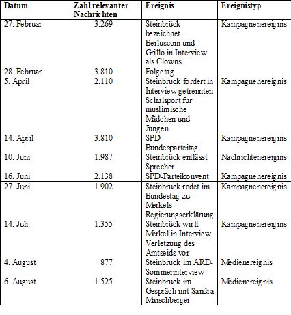 Tabelle 2: Tage, an denen die Worte „Peer“ oder „Steinbrück“ besonders häufig in als relevant eingestuften Nachrichten verwendet wurden